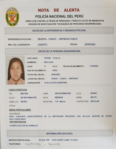 VII Macro Región Policial Cusco a través del Área de Investigación de Personas Desaparecidas del Departamento de Investigación Criminal Cusco, formularon la nota de alerta por la presunta desaparición de la menor Ana Julia TAPARA CCALLA (17).
