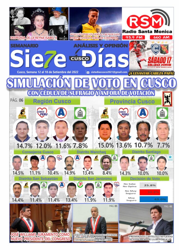 Semanario SIETE DÍAS CUSCO. Actualización Hoy 13 de Setiembre. Edición Semana al 18 de Setiembre del 2022. Simulación de Voto con Cédula de Sufragio Región y Provincia Cusco, Distritos.