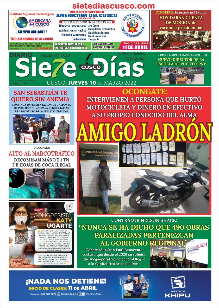 Local Nacional Política RegionalSIETE DÍAS CUSCO. Edición 10 de Marzo del 2022. by Adminmarzo 10, 2022marzo 10, 202201432 Share0