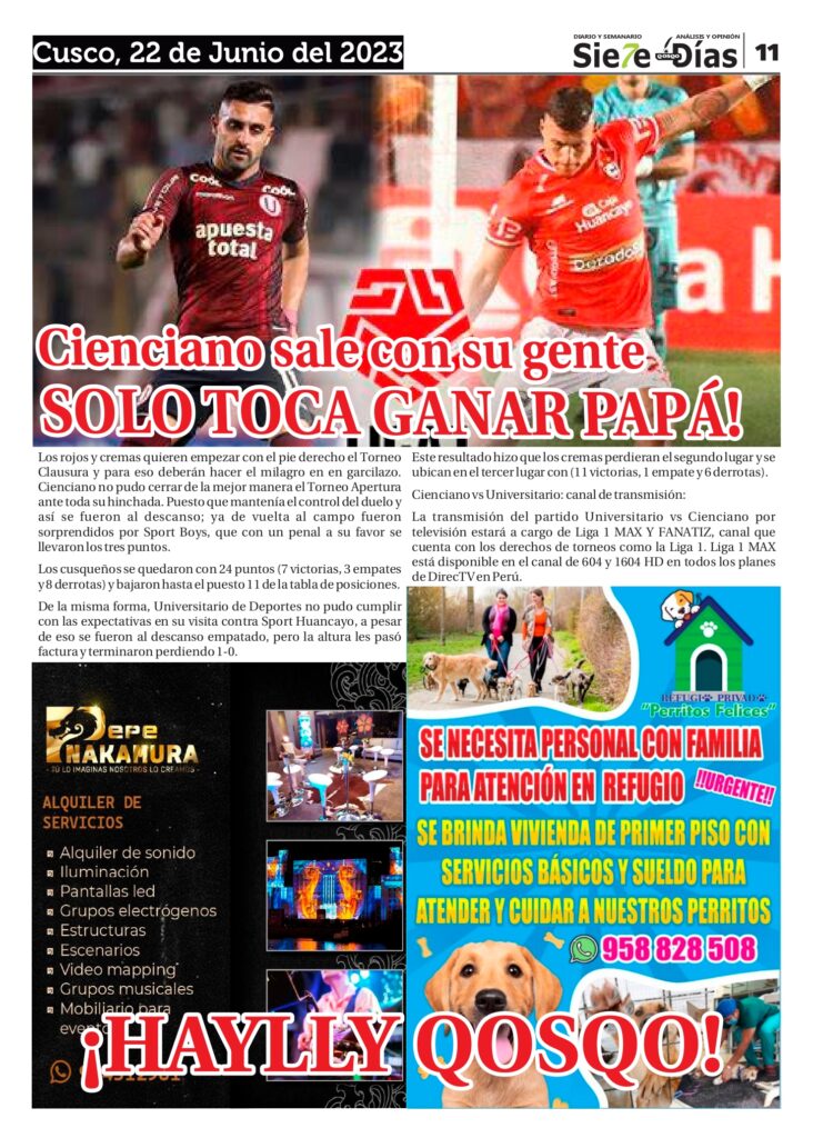 Cultural Deportes Economía Local Nacional Opinión Policial Política RegionalSIETE DÍAS QOSQO Edición Jueves 22 de Junio del 2023 by Adminjunio 22, 2023junio 22, 20230847 Share1 22 06 2023 SDQDescarga