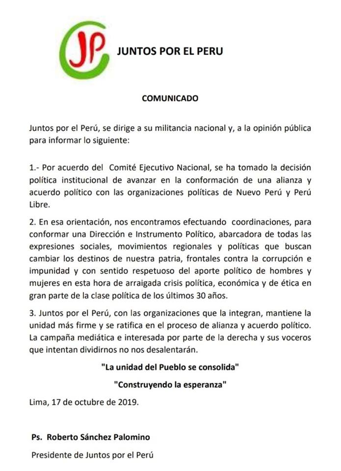 Firma el comunicado el presidente de dicho partido, Roberto Sánchez Palomino, quien indicó “Por acuerdo del Comité Ejecutivo Nacional se ha tomado la decisión política institucional de avanzar en la conformación de una alianza y acuerdo político con las organizaciones políticas de Nuevo Perú y Perú Libre”.